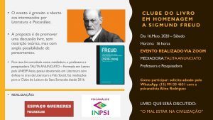 Para não passar a data em branco, o INPSI e o ESPAÇO QUERERES realizam juntos o Clube do Livro em Homenagem a Freud, no sábado, dia 16 de maio, às 16h00, via internet pelo ZOOM.