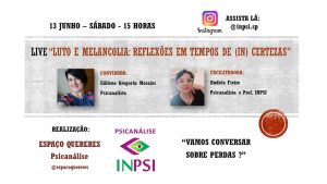O INPSI segue com sua programação de LIVES neste mês de JUNHO. A primeira será uma reflexão sobre perdas, tema pertinente para essa época de pandemia. A psicanalista Edilene Gregorin Morales abordará o tema, tendo a mediação da psicanalista e professora do INPSI, Andréa Freire.